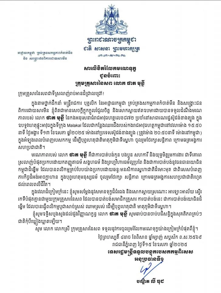 សារលិខិតរំលែកមរណទុក្ខរបស់ ឯកឧត្តម បណ្ឌិត លី ធុជ ទេសរដ្ឋមន្ត្រី អនុប្រធានទី១អាជ្ញាធរមីន ជូនចំពោះក្រុមគ្រួសារនៃសព លោក ផាត មុន្នី