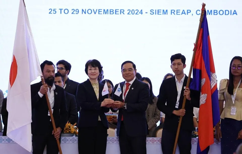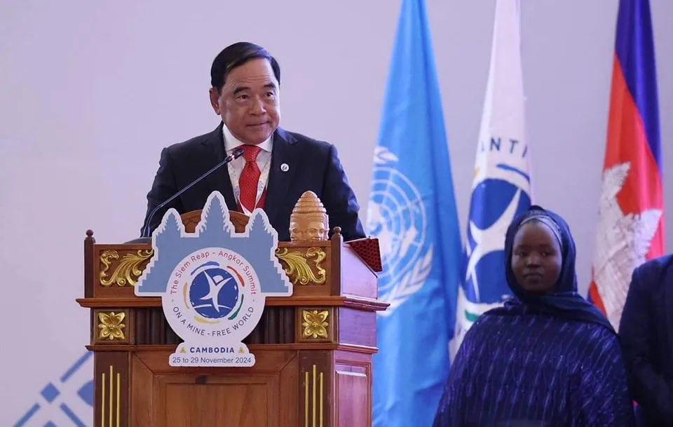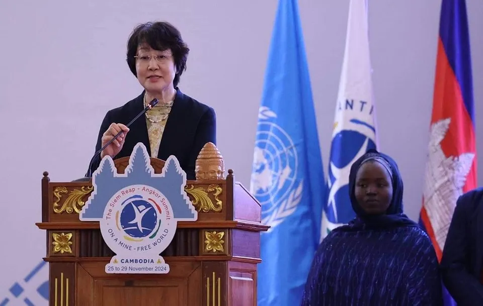 សៀមរាប ថ្ងៃទី២៩ ខែវិច្ឆិកា ឆ្នាំ២០២៤ -- ឯកឧត្តមបណ្ឌិត លី ធុជ ទេសរដ្ឋមន្រ្តី អនុប្រធានទី១ អាជ្ញាធរមីន និងជាប្រធានអនុសញ្ញាអូតាវ៉ាឆ្នាំ២០២៤ អញ្ជើញប្រគល់ទង់ប្រធានអនុសញ្ញាអូតាវ៉ាសម្រាប់ឆ្នាំ២០២៥ ជូនដល់ប្រទេសជប៉ុន តំណាងដោយលោកជំទាវ ICHIKAWA Tomiko ឯកអគ្គរាជទូតវិសាមញ្ញ និងពេញសមត្ថភាព និងជាតំណាងអចិន្ត្រៃយ៍ជប៉ុន សម្រាប់សន្និសីទនៃការរំសាយអាវុធ នៅទីក្រុងហ្សឺណែវ បន្ទាប់ពីបញ្ចប់នៃកិច្ចប្រជុំកំពូលសៀមរាប-អង្គរ ស្តីពីពិភពលោកមួយដែលគ្មានមីន នៅសណ្ឋាគារសុខា ខេត្តសៀមរាប នាល្ងាចថ្ងៃទី២៩ ខែវិច្ឆិកា ឆ្នាំ២០២៤។
