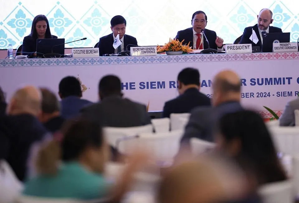 ឯកឧត្តមបណ្ឌិត លី ធុជ ទេសរដ្ឋមន្ត្រី អនុប្រធានទី១ អាជ្ញាធរមីន និងជាប្រធានអនុញ្ញាអូតាវ៉ា ឆ្នាំ២០២៤ អញ្ជើញបន្តដឹកនាំកិច្ចប្រជុំពេញអង្គ ថ្ងៃចុងក្រោយ នៃកិច្ចប្រជុំកំពូលសៀមរាបអង្គរ ស្តីពីពិភពលោកមួយដែលគ្មានមីន នៅសណ្ឋាគារសុខាសៀមរាប ខេត្តសៀមរាប នាព្រឹកថ្ងៃទី២៩ ខែវិច្ឆិកា ឆ្នាំ២០២៤។